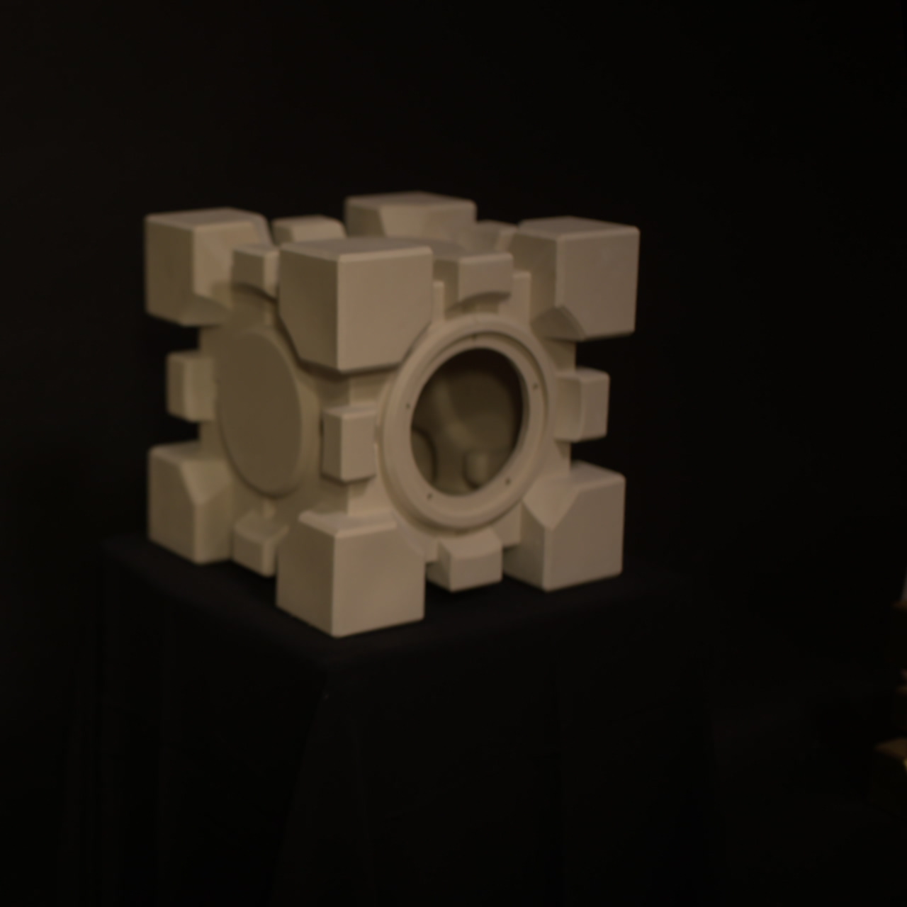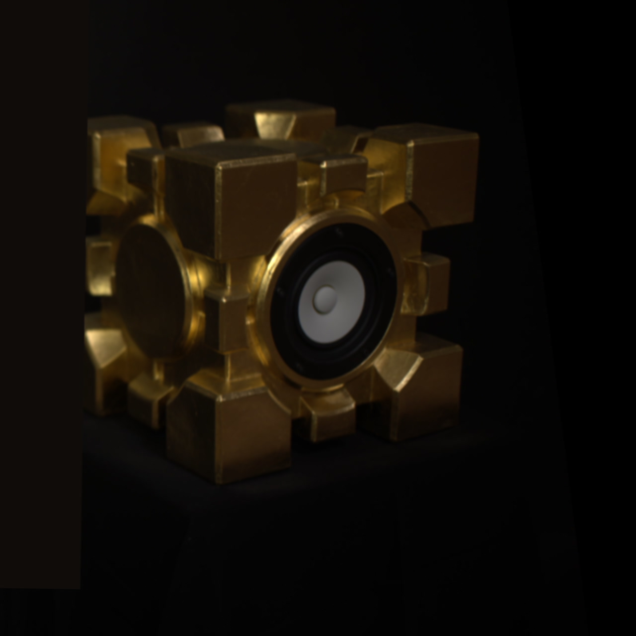 Companion Cube, Gold edition 2026, uit Portal: 2, keramiek met glazuur en 23kt bladgoud. Werkwijze: 3d geprinte maldelen afgegoten in silicone. Vijf zijdes in gips en de opening zijde ook in gips. Mal in elkaar en gietklei erin. Na drogen in biscuit stook en glazuur stook. Handwerk bladgoud aanbrengen. klank: droog, helder