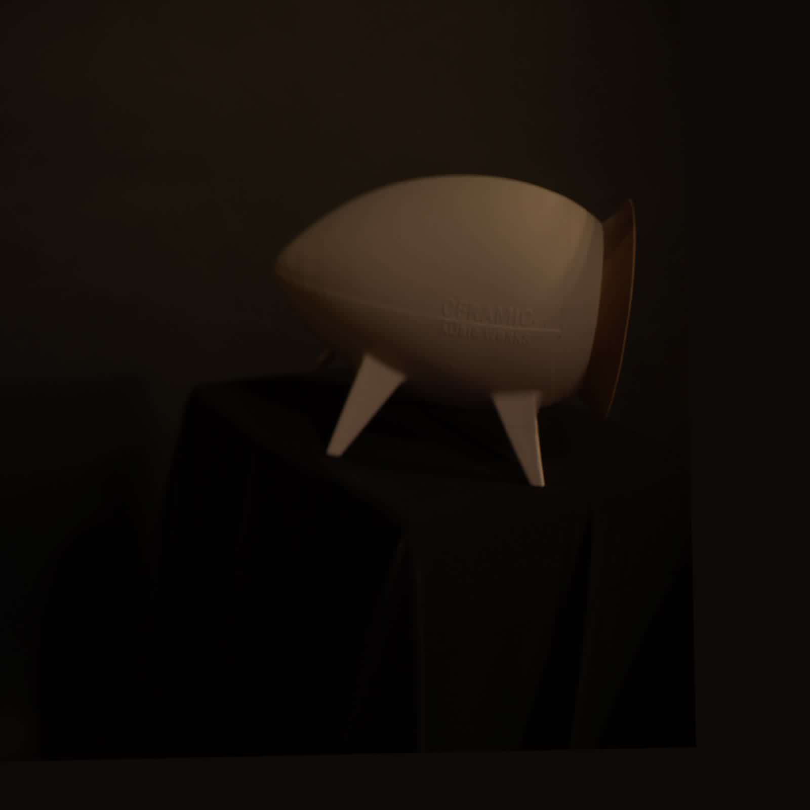 Pocket Rocket, keramiek met Iepen houten ring aan voorzijde, geinspireerd op luchtvaart en zeppelin vorm, de driver is een Markaudio Alpair 7 MS. klank: gedetailleerd